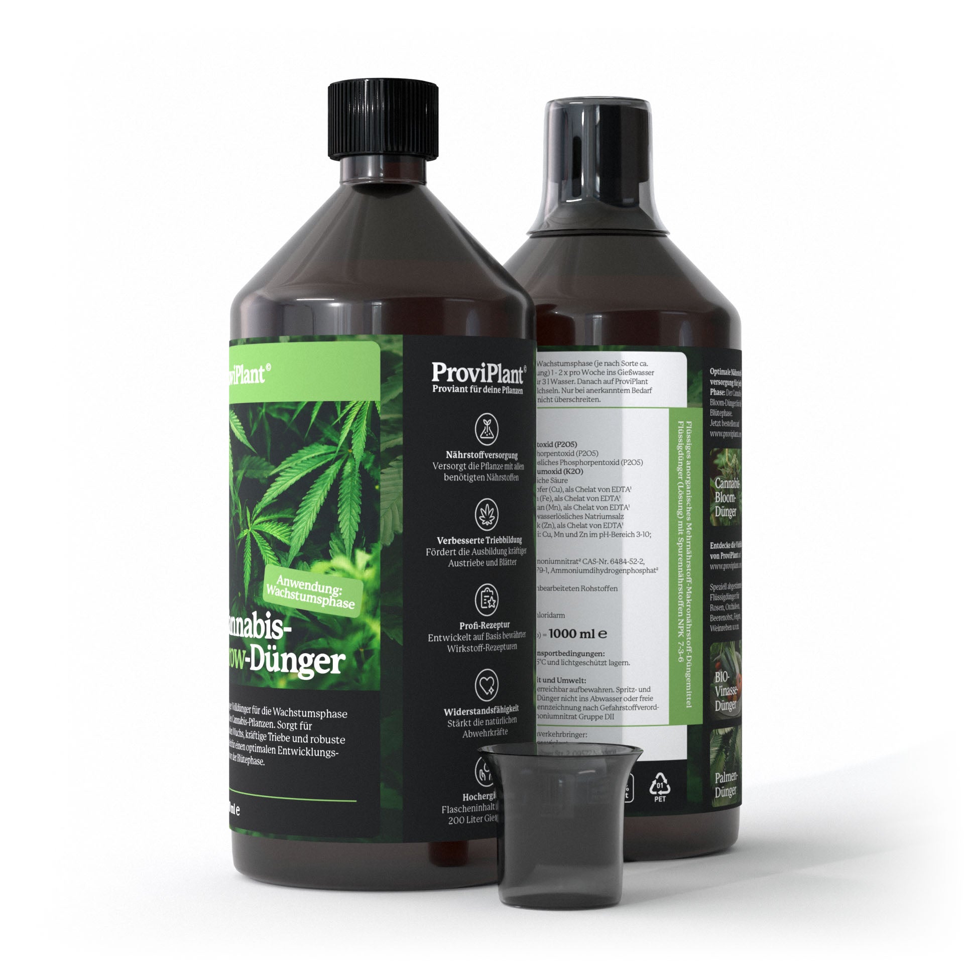 | Inhalt | 1 Liter Flüssigdünger (NPK 7-3-6), Flasche und Dosierkappe aus recycelten Materialien |